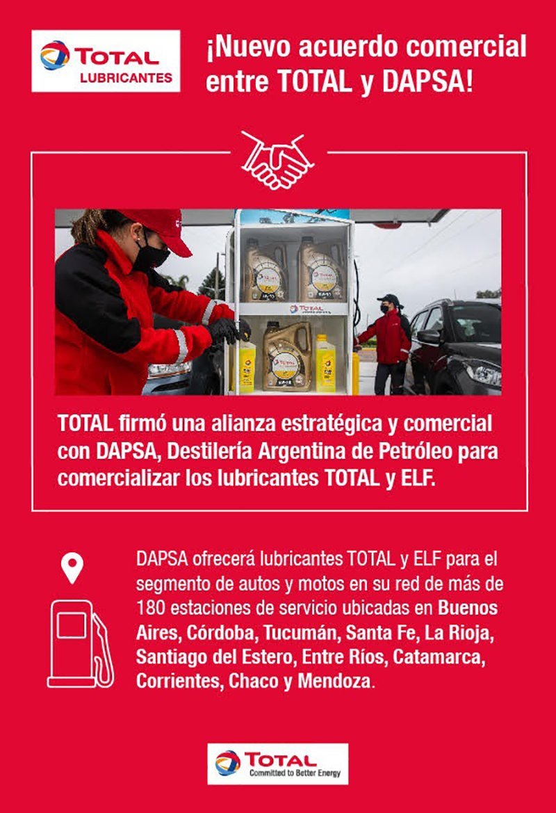 Total Especialidades Argentina, la compañía líder en el desarrollo de lubricantes de última tecnología, anuncia una alianza estratégica y comercial con DAPSA, Destilería Argentina de Petróleo para comercializar los lubricantes TOTAL y ELF.