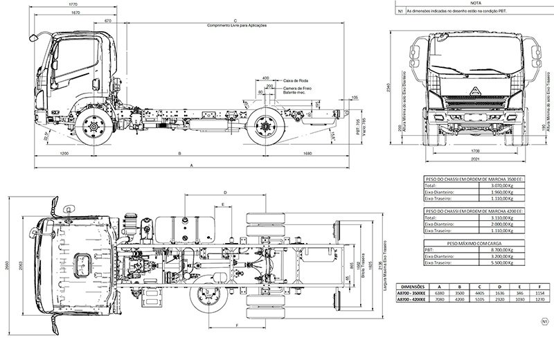 Su distancia entre ejes es de 3.750 mm, mientras el largo del chasis es de 6.770 mm y llantas en medida 215/75-17,5.