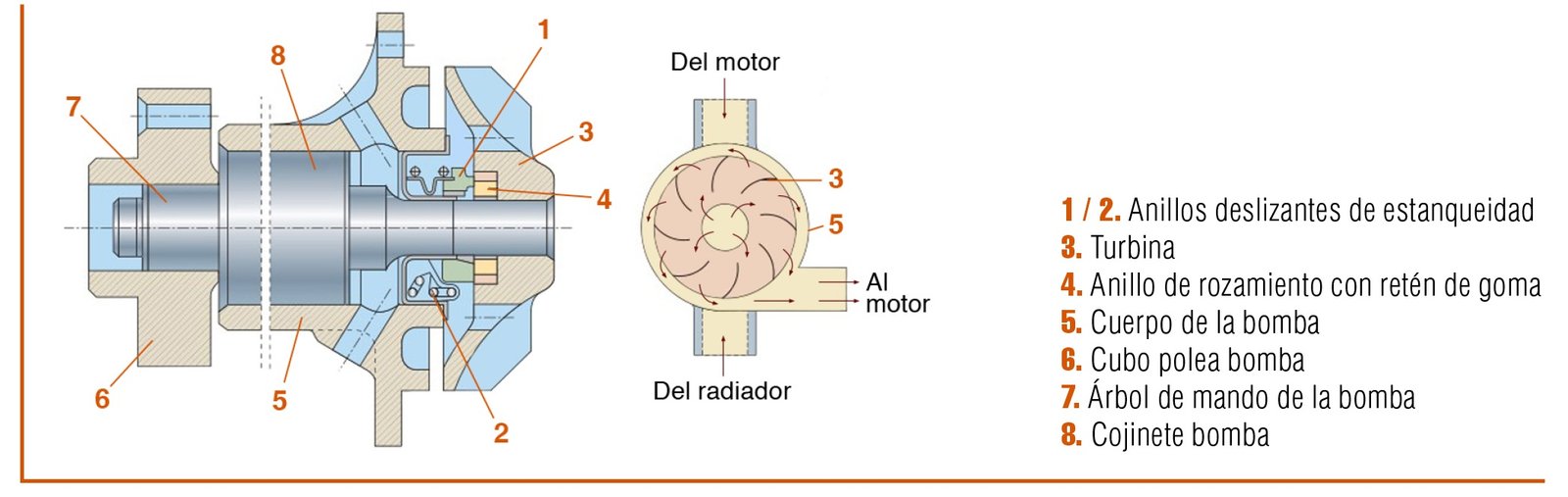 La bomba de agua está formada por un árbol de mando (7) que gira sobre cojinetes de bolas (8) y recibe movimiento a través de la polea que se monta sobre el cubo (6). En el otro extremo del árbol se encuentra el rotor o turbina (3), cuyas aletas, al girar, hacen circular el líquido. El conjunto va montado sobre el cuerpo de bomba (5). Con el fin de evitar fugas entre el cuerpo y el eje se disponen las juntas de estanqueidad (1 y 2).