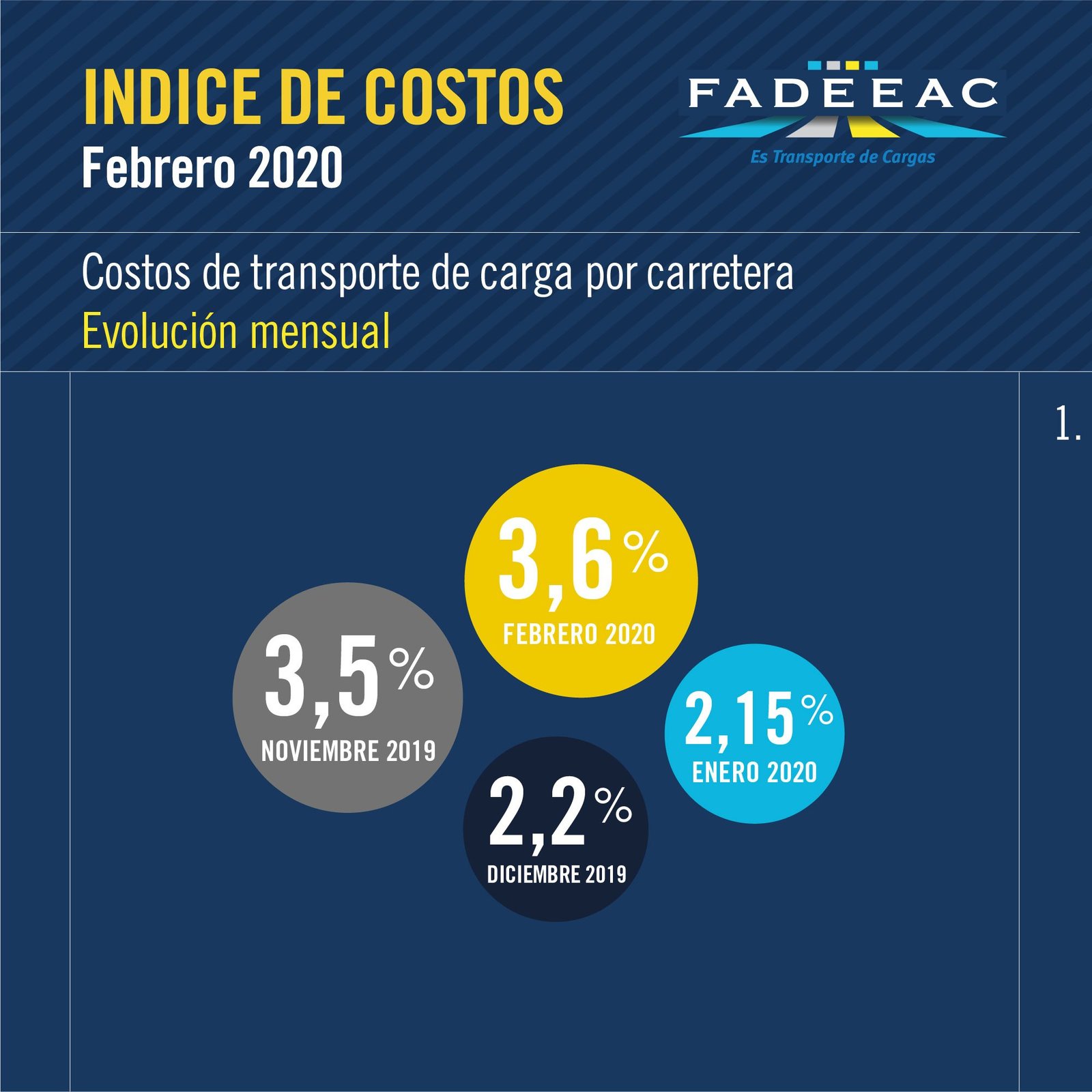 Que se mantengan estables varios insumos claves como el combustible, los peajes y el dólar, así como los menores incrementos relativos al personal, permiten prever que los aumentos no serán tan grandes en lo próximo. Sin embargo, en febrero la suba fue elocuente, también a partir de la aceleración de los costos en rubros vinculados a la mano de obra, como Reparaciones (3,9%) y Gastos Generales (5,7%). El cálculo incorpora la asignación extraordinaria no remunerativa acordada por FADEEAC y la Federación Argentina de Trabajadores Camioneros.