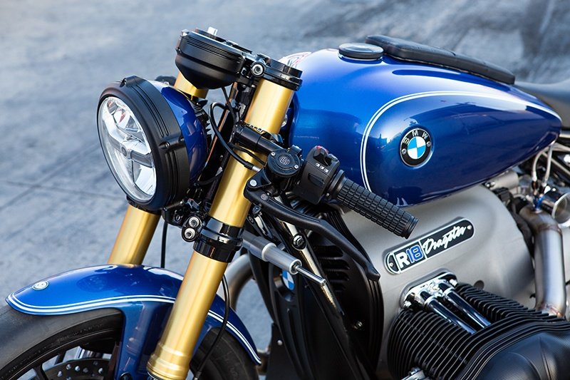 7. El acabado de la pintura es de un azul metálico de dos tonos con rayas clásicas en blanco y negro de BMW por el pintor Chris Wood de Roland Sands.