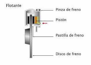 Un cáliper flotante o deslizante, generalmente tiene un pistón fijo para ambas pastillas de freno, y el cáliper está “flotando’ sobre unos pernos guía. Cuando aumenta la presión hidráulica, el pistón acciona sobre una de las pastillas y sobre el cáliper.