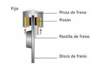 Un cáliper fijo tiene un pistón o pistones para cada pastilla de freno y el cáliper está fijo: y cuando aumenta la presión hidráulica, los pistones presionan a las pastillas contra el disco.