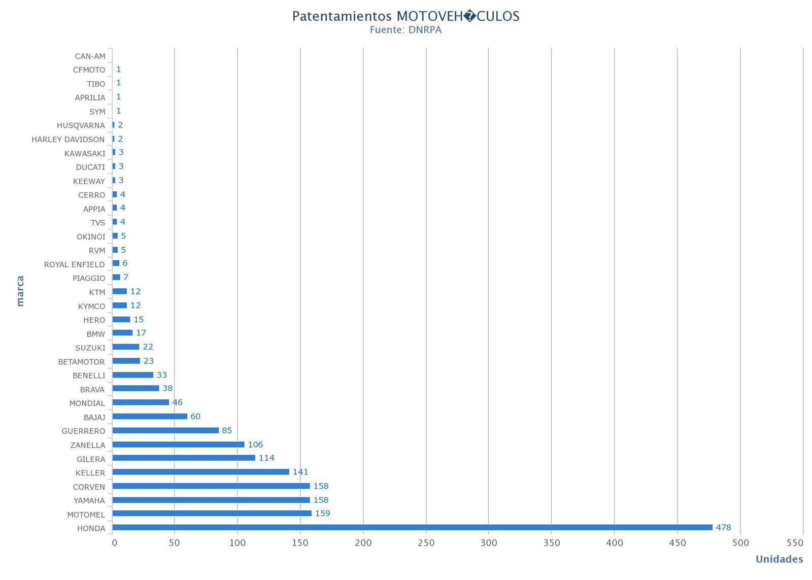 La Cámara de Fabricantes de Motovehículos (CAFAM), informó que en lo que va del año se patentaron 310.059 unidades, un 44,26% menos que en el mismo periodo del año anterior. Las motos más vendidas continúan siendo las de baja cilindrada y más del 90% de las patentadas de lo que va del año fueron de origen nacional.