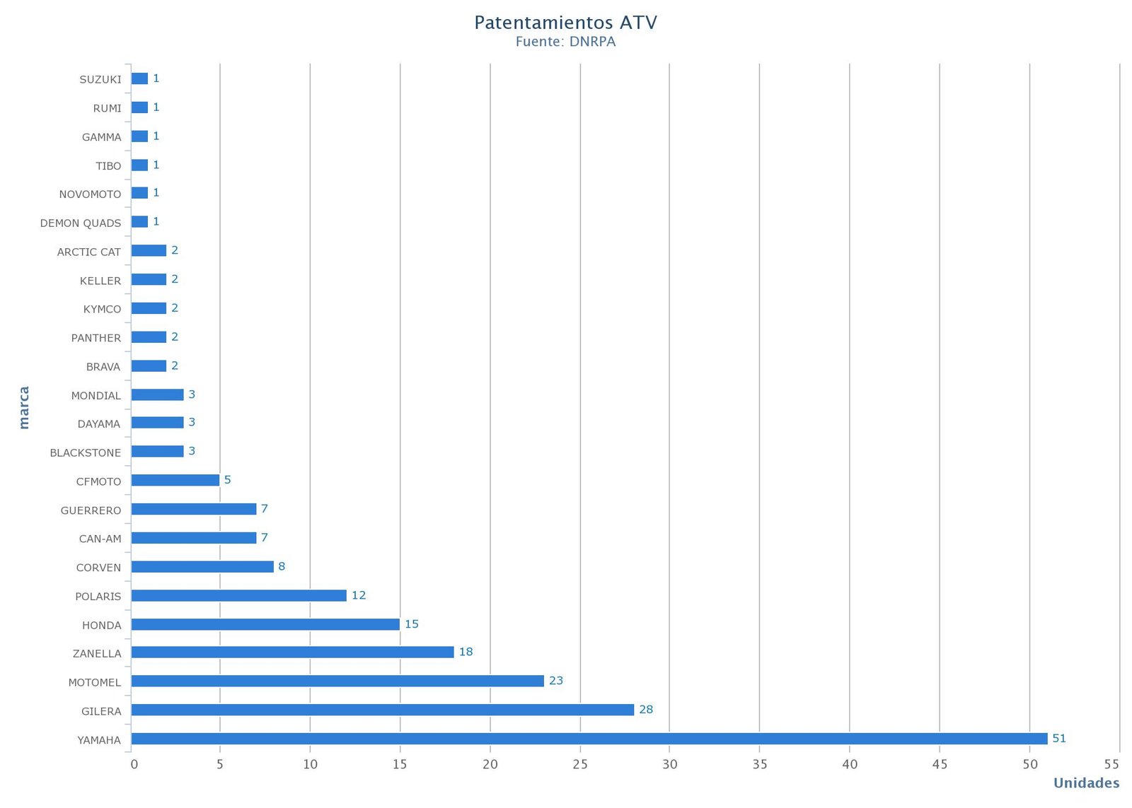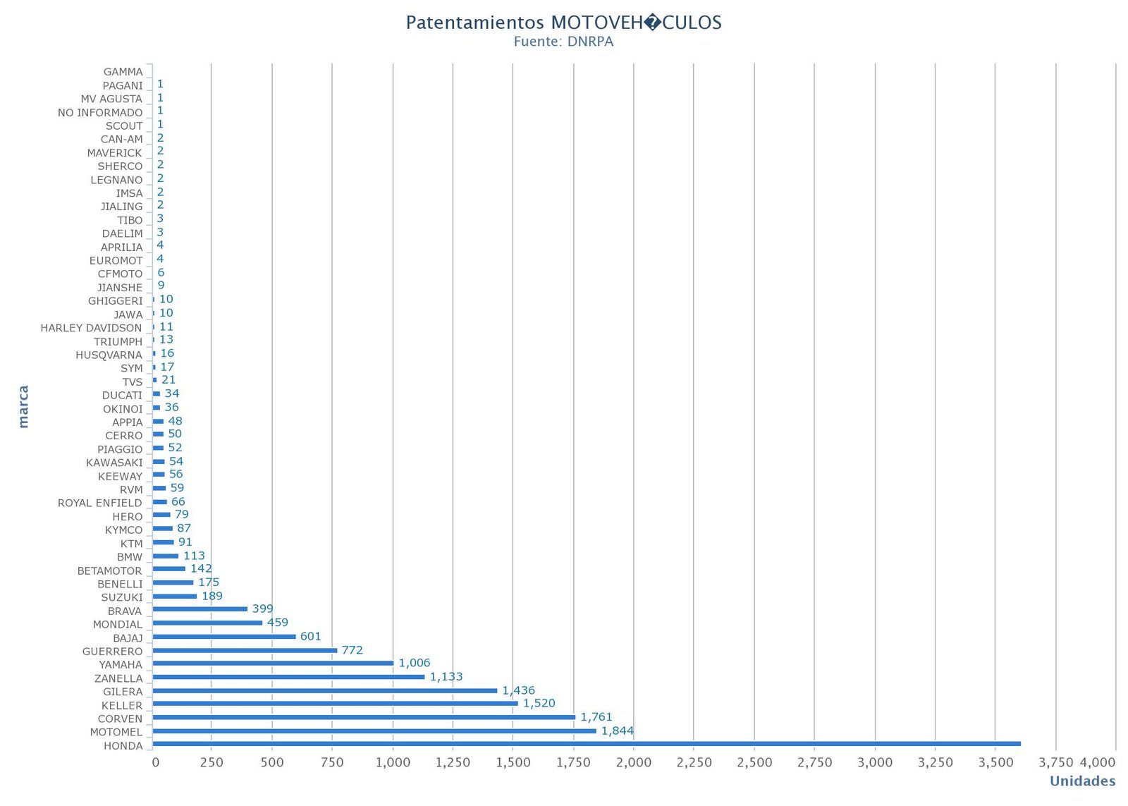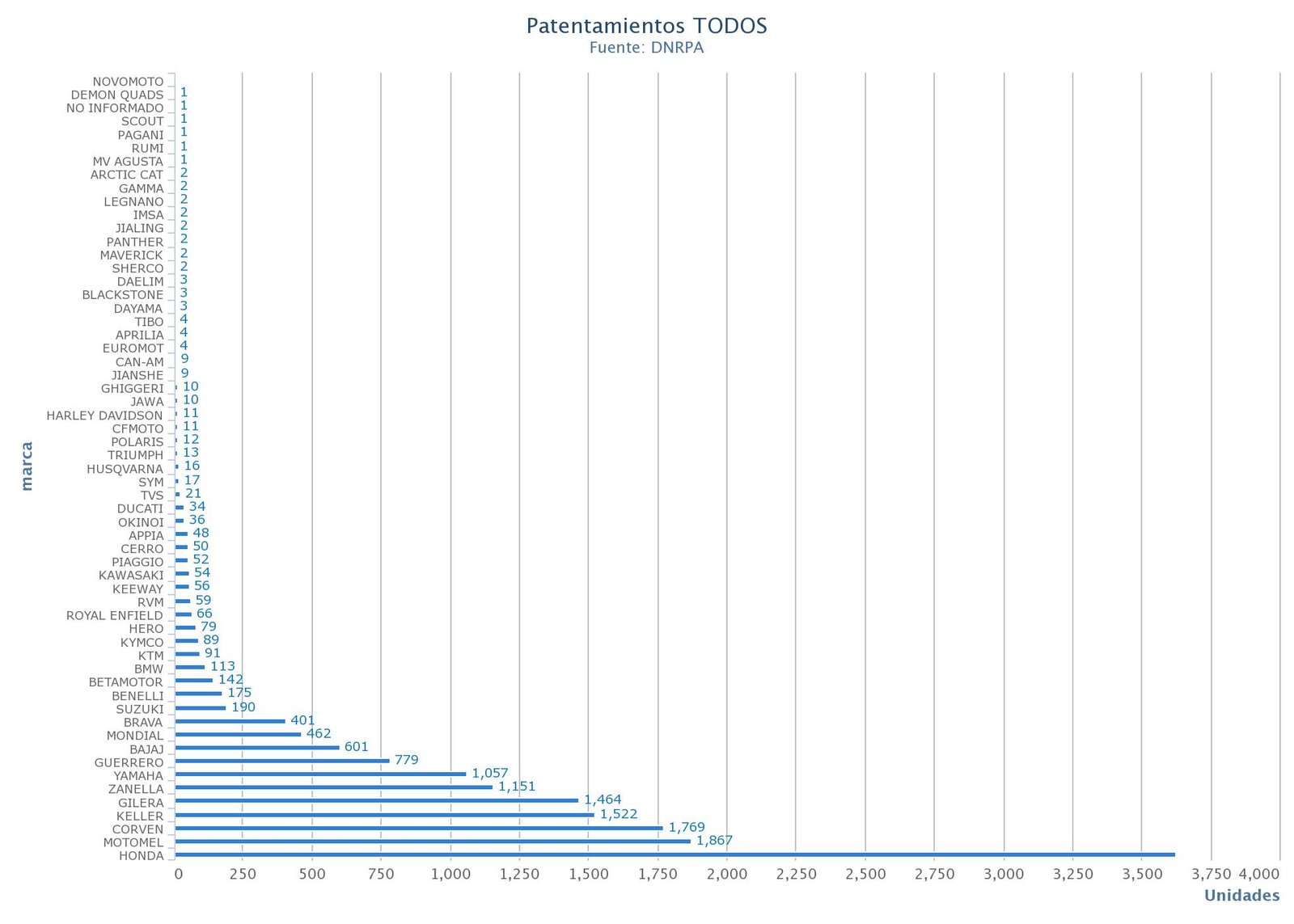 La Cámara de Fabricantes de Motovehículos (CAFAM), informó que en 2019 se patentaron 326.275 unidades, un 44,03% menos que el año anterior y un 53,14% menos que en 2017. La región Pampeana encabezó el ranking: Buenos Aires, Santa Fe y Córdoba las provincias con mayor cantidad de patentamientos en 2019.