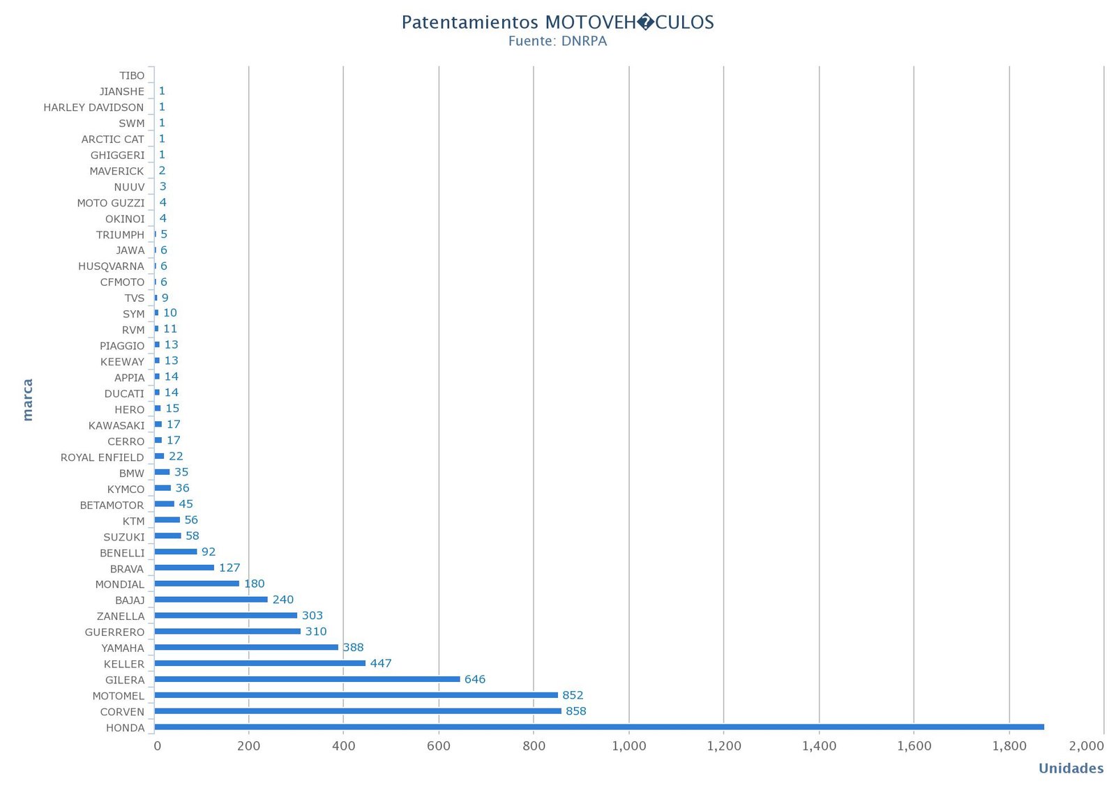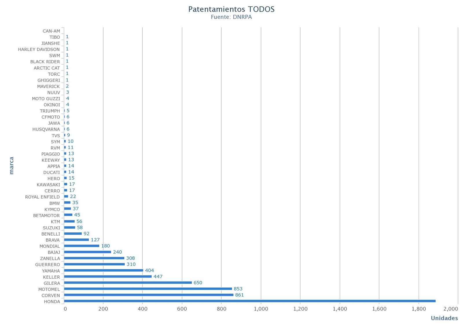 Según informó la Cámara de Fabricantes de Motovehículos en lo que va del año se patentaron 47.926unidades, un 37,51 % menos que en el mismo periodo del año anterior.