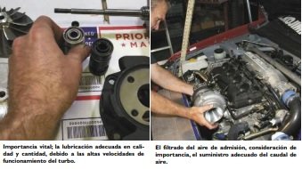 Todas las veces que se abre por alguna razón el sistema de escape conviene comprobar cuidadosamente si hay objetos sueltos. Pedacitos de metal como rebabas o salientes del molde de fundición también pueden desprenderse cuando sufren la Actualmente los turbos son fabricados “al estado del arte”, recurriendo a una tecnología aeroespacial, y es vital para su mantenimiento; comprobar el desgaste de los cojinetes y la limpieza de los rotores. acción del calor y la presión de los gases de escape. Cuando se rearma el sistema, hay que asegurarse de que las juntas están perfectamente en posición. Los pedazos de material de junta que sobresalen dentro de la apertura también pueden desprenderse e interferir con el funcionamiento del turbosobrealimentador.