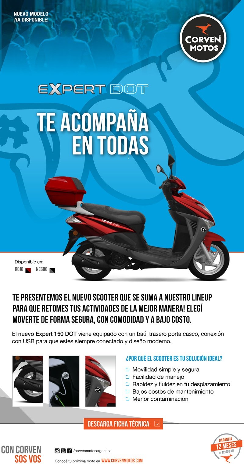 Corven Motos presenta un nuevo modelo que llega para completar la familia de scooters de la marca. Desarrollado por el departamento de diseño de Corven Motos, el Expert DOT es un scooter ideal para trasladarse de manera práctica, cómoda, segura y a bajo costo. Con un alto estándar de calidad en todos los detalles, uno de los sellos distintivos de la marca, el Expert DOT se distingue por su diseño y estilo actual de líneas modernas bien definidas y por su equipamiento pensado para satisfacer las necesidades actuales de movilidad. En este aspecto se destacan el baúl trasero porta casco y la amplia baulera debajo del asiento, el neumático delantero de 12’’, freno delantero a disco, potentes ópticas full LED, confortable asiento biplaza y un puerto USB para la recarga de dispositivos electrónicos.