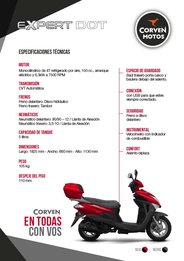 El Expert DOT viene equipado con un ágil y robusto motor monocilíndrico de 150 cc de 4 tiempos con caja automática y ya se encuentra disponible en la amplia red de concesionarios Corven Motos de todo el país en colores rojo y negro a un precio de $103.990 con garantía de 12 meses o 12.000 kilómetros. El Expert DOT cumple con los más estrictos controles de calidad y dispone a nivel nacional de toda la gama de repuestos originales debidamente codificados que garantizan su autenticidad.