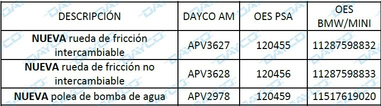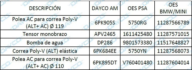 Como proveedor de componentes originales de correa de transmisión accesoria de extremo frontal (FEAD por sus siglas en inglés) para motores de gasolina Prince de 1,4/1,6 l y 4 cilindros de MW/MINI-PSA, Dayco incorpora las siguientes referencias nuevas a la gama de productos para el mercado de accesorios: