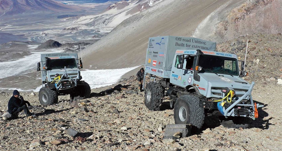 La hazaña fue lograda por la compañía Extrem Events, al mando de Matthias Jeschke, un experimentado conductor y especialista en este tipo de desafíos que ya había alcanzo un récord en 2014 con un Mercedes-Benz Zetros, aunque inicialmente ese no había sido su principal objetivo: para mejorar la seguridad de montañistas e investigadores científicos que realizan expediciones frecuentemente en la zona del volcán más alto del mundo, el Ojos de Salado, tenían la misión de instalar cuatro unidades de radio de emergencia en varios campamentos de gran altitud: a más de 6.000 metros de altura. Pero luego de colocar la cuarta unidad radiofónica, el equipo se propuso romper el récord de altitud para vehículos con ruedas, logrado por uno de los Unimog U 5023 al alcanzar los mencionados 6.694 metros sobre el nivel del mar.