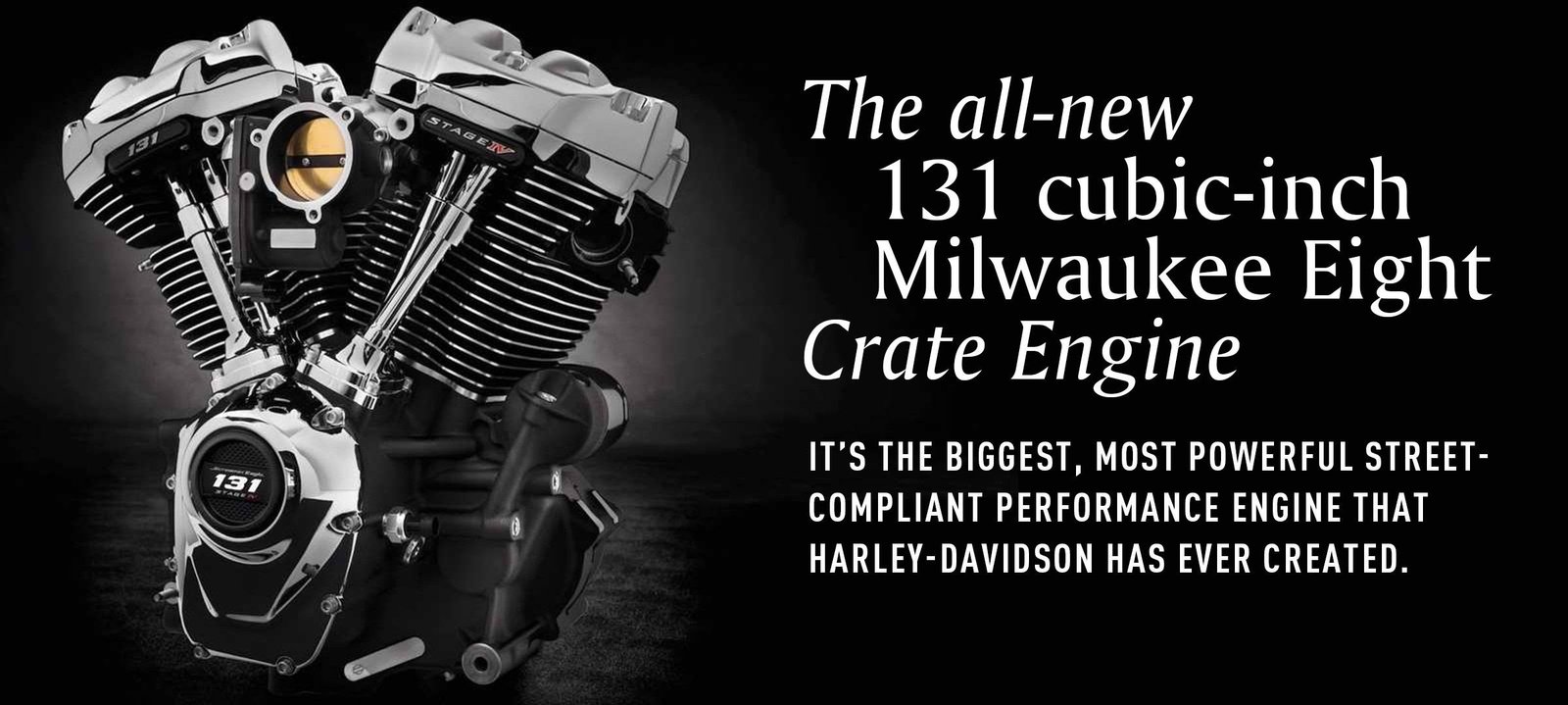 Aunque el año pasado Harley-Davidson, lanzó su primera moto eléctrica y prepara la segunda, continúa fabricando motores a combustión enormes, como el recientemente presentado. Es así que Harley-Davidson bate sus propios récords, porque fabricó el motor más grande y potente de su historia, bautizado Screamin Eagle Milwaukee Eight 131 Crate, con la meta de que llegue a las motos de la familia touring de 2017 en adelante; siendo las únicas unidades que lo podrán incluir sin perder su garantía oficial.