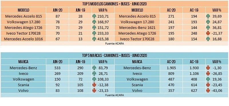 Viendo por marcas, las ventas de junio 2020 las encabeza Mercedes-Benz, entre los modelos, el Mercedes-Benz Accelo 815 lideró entre los camiones; y el Renault Kangoo II, entre los utilitarios.