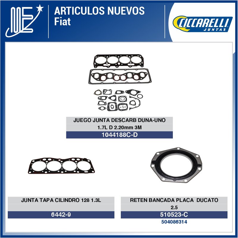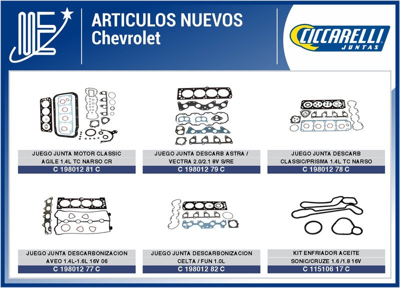 Artículos Ciccarelli para Chevrolet, Fiat y Peugeot, con kits de juntas y accesorios clave para motores.