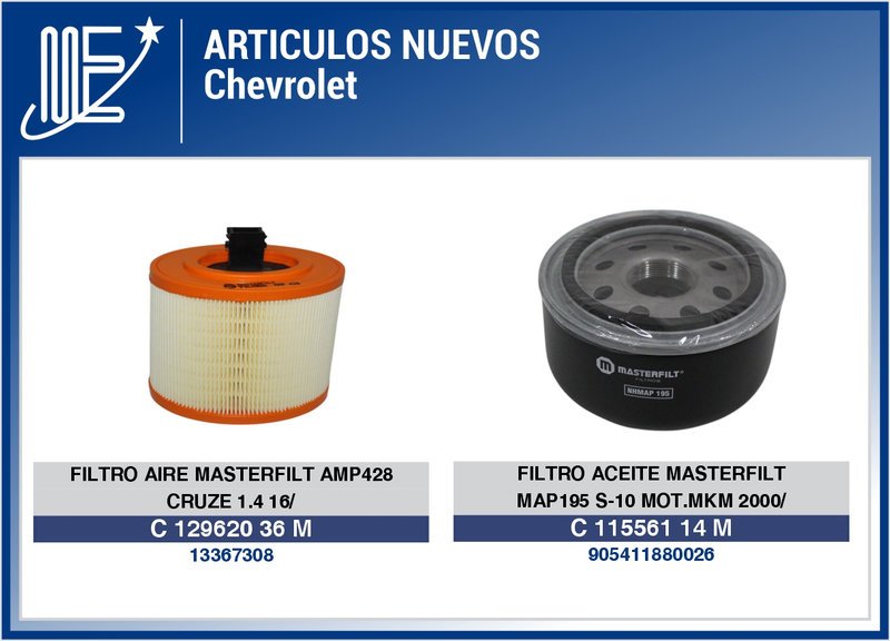 - Filtros Masterfilt para Chevrolet: incluye filtro de aire para Cruze y filtro de aceite para S-10. Diseñados para mantener el motor limpio y eficiente