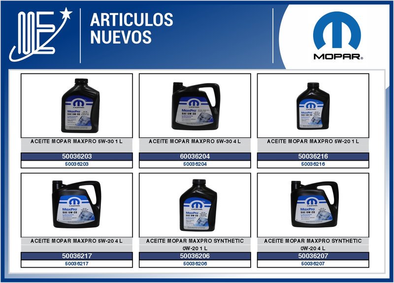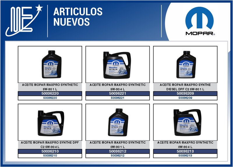 - Aceites Mopar: disponibles en 12 especificaciones diferentes, cubriendo diversas necesidades de lubricación según el modelo y tipo de motor.