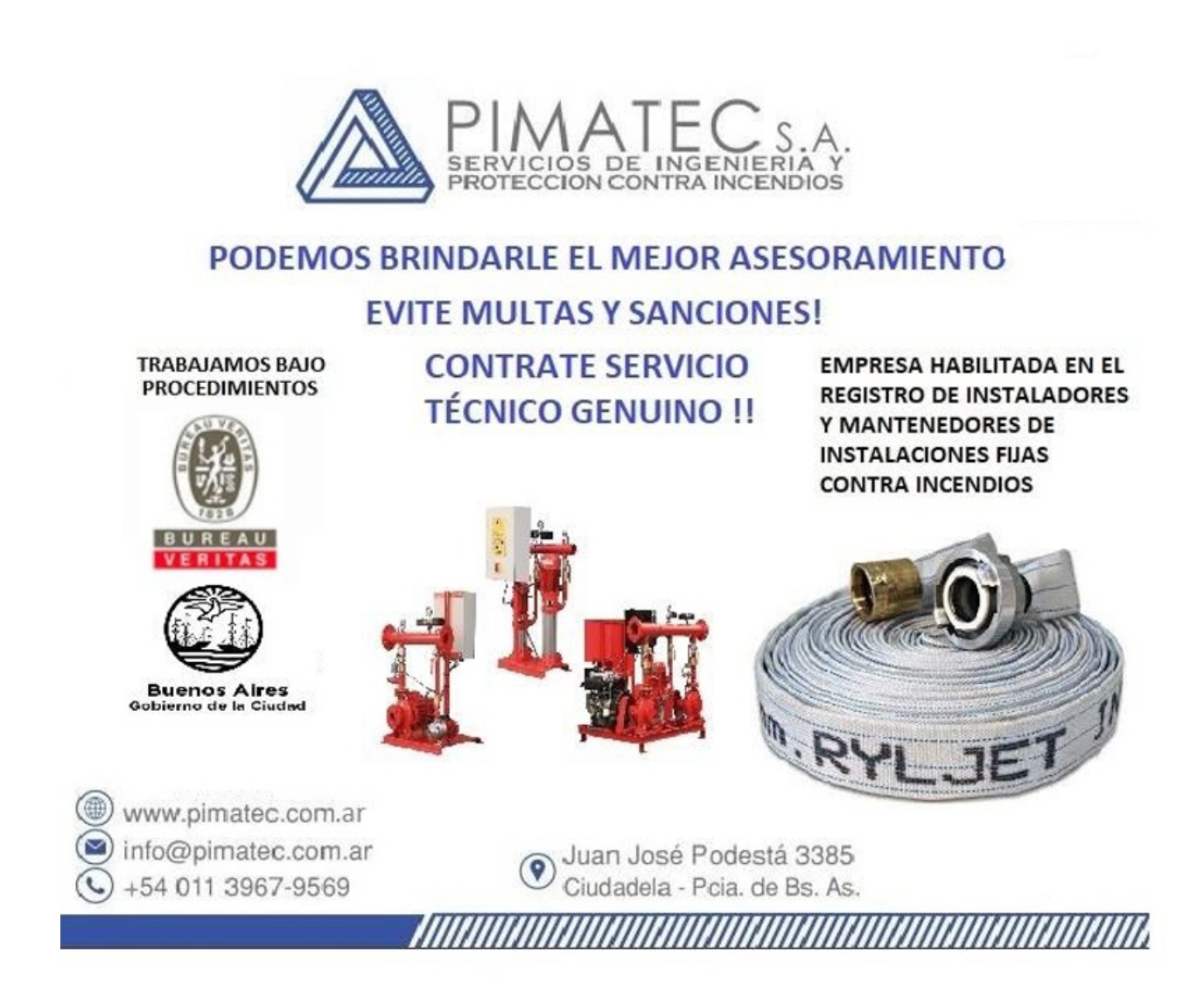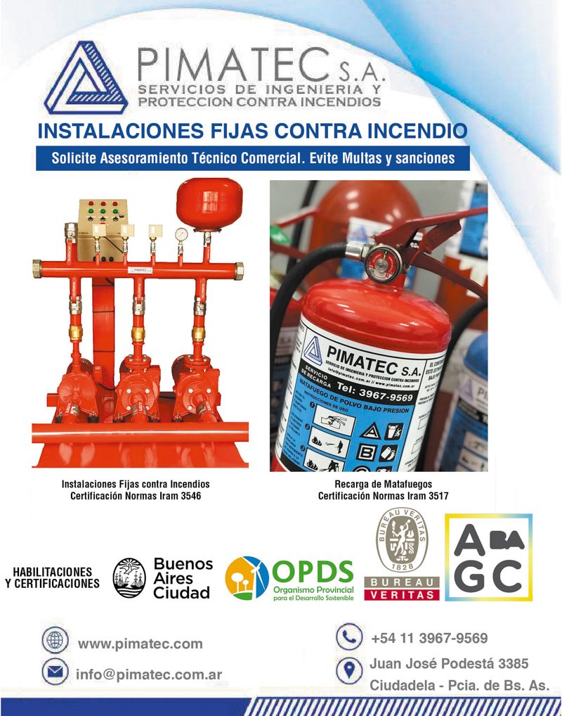 Las crecientes exigencias en protección contra incendios demandan servicios confiables y técnicamente sólidos. PIMATEC S.A. ofrece proyectos, instalaciones y mantenimiento de sistemas fijos contra incendios, con certificaciones clave como IRAM 3546 (mantenimiento), IRAM 3594 (pruebas de mangueras) e IRAM 3501 (fabricación e instalación).