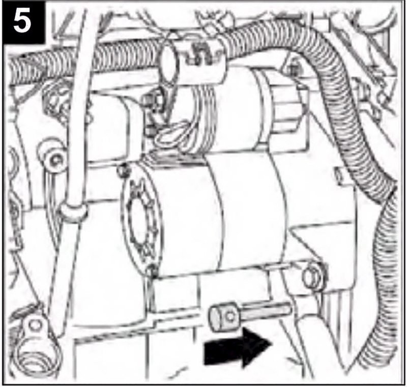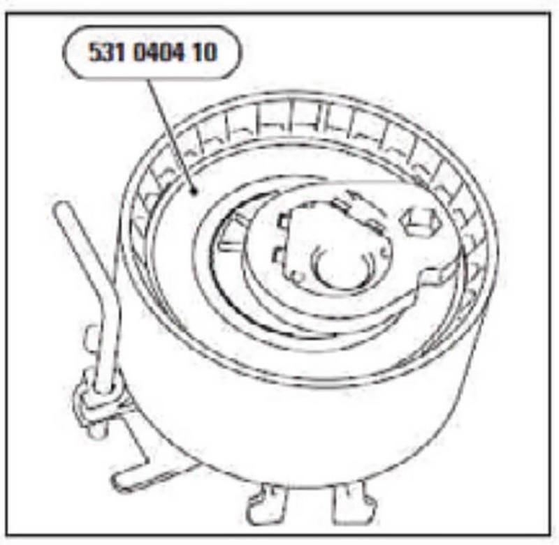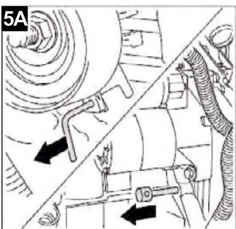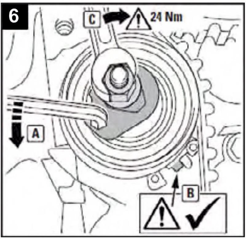 7-Instale la nueva correa de distribución en sentido antihorario, comenzando con el cigüeñal. Luego retire los pasadores de bloqueo tensor y volante (Fig 5A).