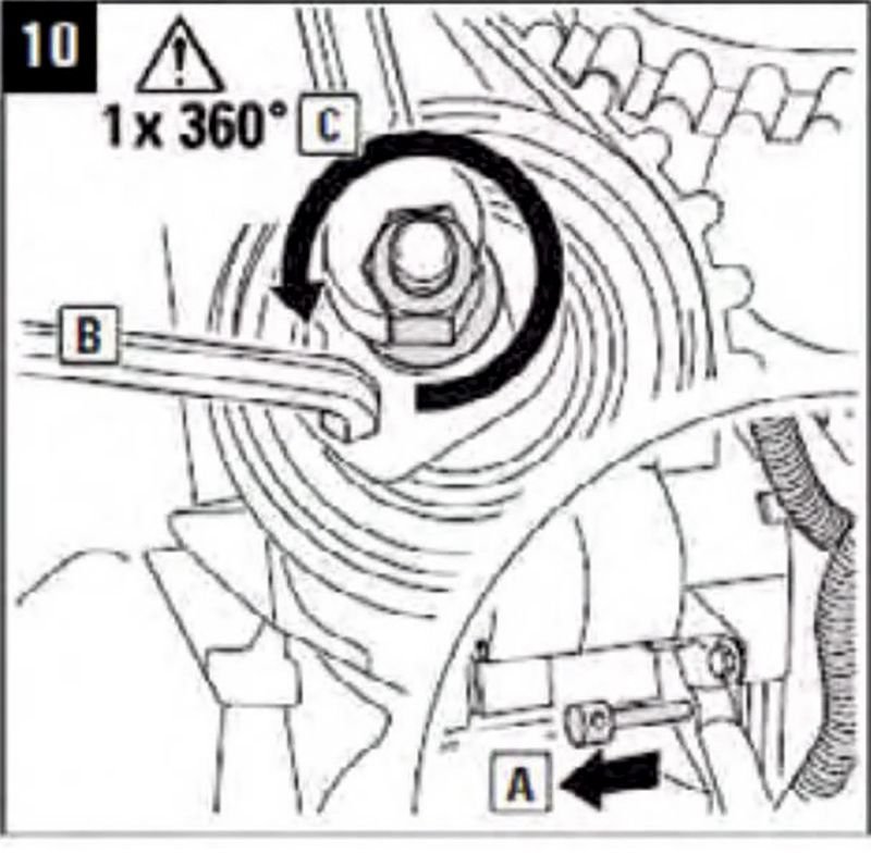 8-Tensión de la correa dentada. “A” – mueve el tensor por medio de una llave allen en la dirección de en sentido antihorario hasta que el puntero “B” alcance la posición máxima tensión. En este momento dar un par (apriete) de 24 Nm en la tuerca con la llave x la “C”.