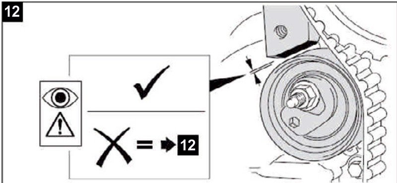 14- IMPORTANTE (Fig. 12): El tensor no debe tocar el bloque del motor bajo ninguna circunstancia. Si esto sucede durante el ensamblaje, tendremos que repetir el proceso desde el punto 3 (Fig. 2.)