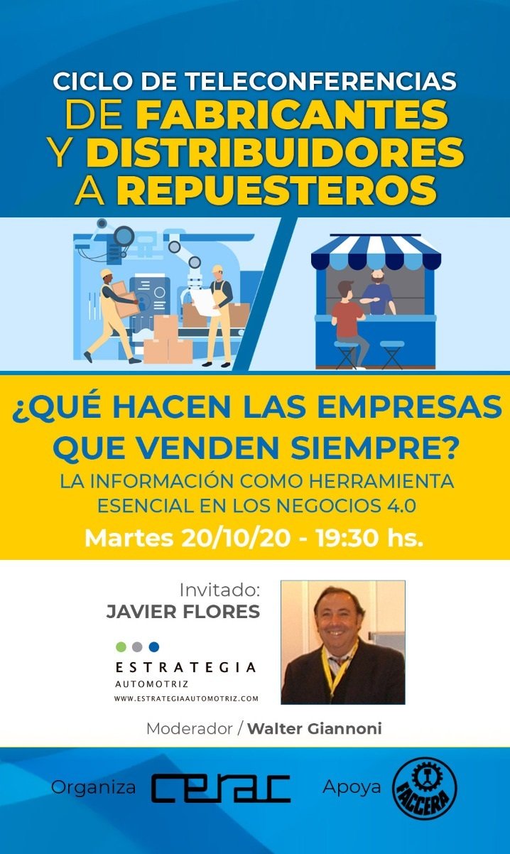 El próximo invitado a este programa es el Lic. Javier Flores, Director de Estrategia Automotriz consultora especializada en la Investigación y Relevamiento en el Mercado Autopartista. En esta ocasión conversará con los repuesteros acerca de cómo la información se convierte en una herramienta esencial en los Negocios 4.0.