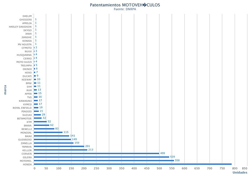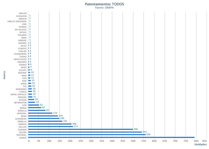 De acuerdo con los datos de CAFAM, en julio 2020 el 90,94% (20.740 unidades) de las motos patentadas fueron de origen nacional y el 9,05% ( 2.065 unidades) importadas.