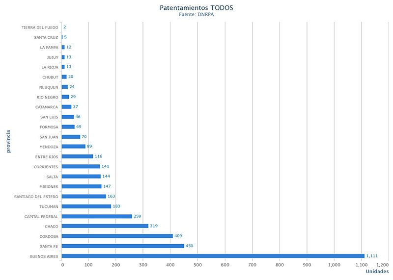 Respecto al informe mensual de la Cámara, las provincias con más patentamientos en julio 2020 fueron Buenos Aires con 5.832, Santa Fe con 3.129 y Córdoba con 2.186 Las siguen Chaco con 1.496 y CABA con 1.290.