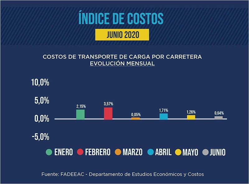 Según el Departamento de Estudios Económicos y Costos de la Federación Argentina de Entidades Empresarias del Autotransporte de Cargas (FADEEAC) el mes de junio tuvo un aumento para el sector del 0,64%, en línea con la tendencia a la desaceleración de los meses previos (1,7% y 1,3% en abril y marzo, respectivamente). De esta manera, el total acumulado en estos primeros 6 meses del 2020 fue del 9,7%, apenas por debajo de los dos dígitos en un contexto de caída de la actividad como consecuencia de la pandemia. Los datos surgen del Índice de Costos del Transporte FADEEAC (ICTF) elaborado mes a mes por la federación y que mide 11 rubros que impactan directamente en los costos de las empresas del transporte de cargas de todo el país. La metodología del índice fue verificada por el Centro de Investigación en Finanzas de la Universidad Torcuato Di Tella (UTDT) a partir de datos primarios y una estructura de costos obtenidos de manera independiente por la federación.