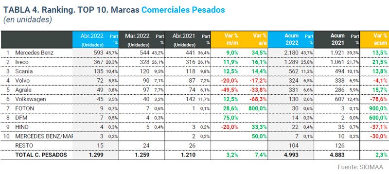 Así como el Iveco 170 E se ubicó como el modelo de camión más vendido de abril, el ranking entre las marcas tuvo nuevamente como dominadora a Mercedes-Benz.