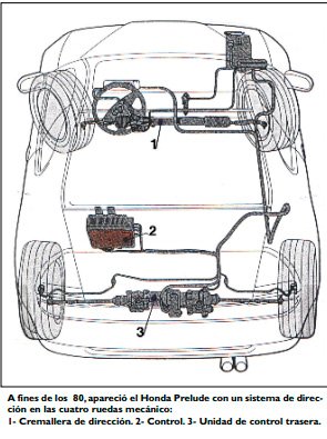 A fines de la década de los 80, existió un sistema totalmente mecánico de dirección en las cuatro ruedas, en el modelo Prelude de Honda, los automóviles actuales son equipados con sistemas de dirección en las ruedas traseras, como Renault, BMW, Porsche, etc. con motores eléctricos, que permiten una mejor adaptación del sistema, a las diferentes situaciones de conducción.