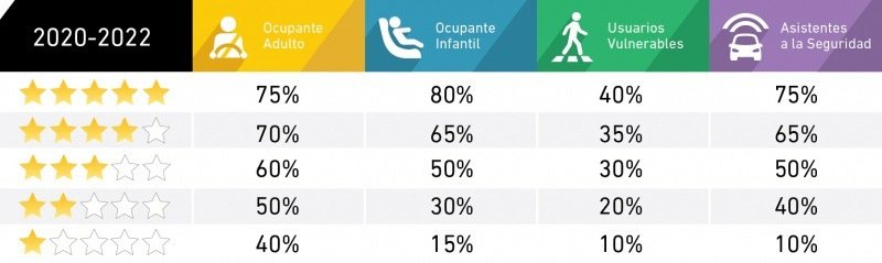 En esta primera etapa del protocolo, para lograr un resultado de cinco estrellas será necesario simultáneamente al menos un 75% de puntaje en Protección de Ocupante Adulto, al menos un 80% en Protección de Ocupante de niños, al menos un 50% en Protección de Peatones y VRU y al menos un 75% en Sistemas de Asistencia a la Seguridad. Latin NCAP aumentará los porcentajes de puntos necesarios en cada aspecto a lo largo de los años para alcanzar los niveles de calificación de estrellas.