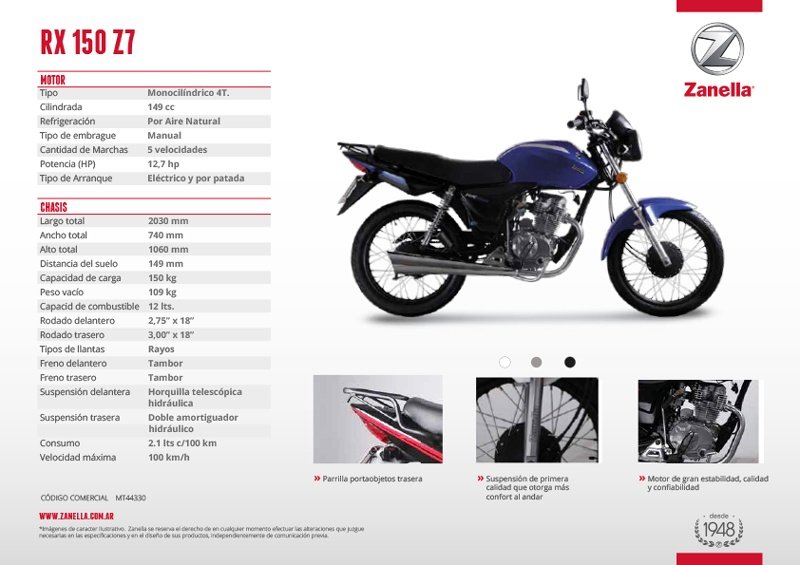 Zanella ha seleccionado para comercializar mediante este ventajoso plan de financiación tres de sus modelos de mayor aceptación entre el público. La primera de ellas es la moto urbana ZB 110 LT, que ofrece una excelente prestación para la movilidad. Asimismo Zanella suma a Mi Moto la RX 150 en su versión Z6, con llantas de aleación, y la Z7, con ruedas con rayos. Se trata de una street estilo deportiva ideal para el traslado diario con gran agilidad y eficiencia. Ambos modelos vienen equipados con un robusto y eficiente motor de 150 cc, asiento biplaza deportivo con doble altura, completo instrumental, luces LED y parrilla.