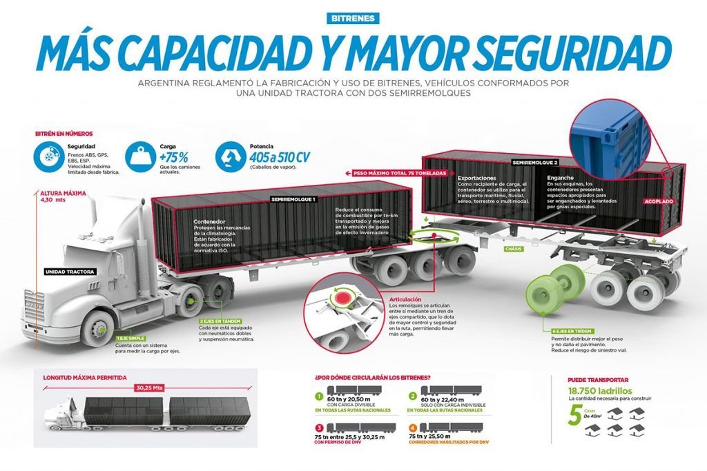 Los bitrenes, conformados por tractores por encima de los 400 caballos y dos semirremolques unidos por una “quinta rueda”, permiten transportar entre 60 y 75 toneladas según su configuración, y ya están habilitados para circular por corredores autorizados.