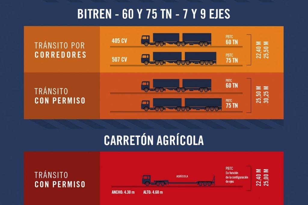 En cuanto a las rutas aprobadas, el Ministerio de Transporte de la Nación, a través de Vialidad Nacional, determinó la habilitación de más de 15.000 kilómetros de red vial nacional para la circulación de camiones con equipos bitren de hasta 25,50 metros de largo. También denominados “corredores”, esta nueva modalidad de transporte podrá circular por dos importantes trayectos centrales.