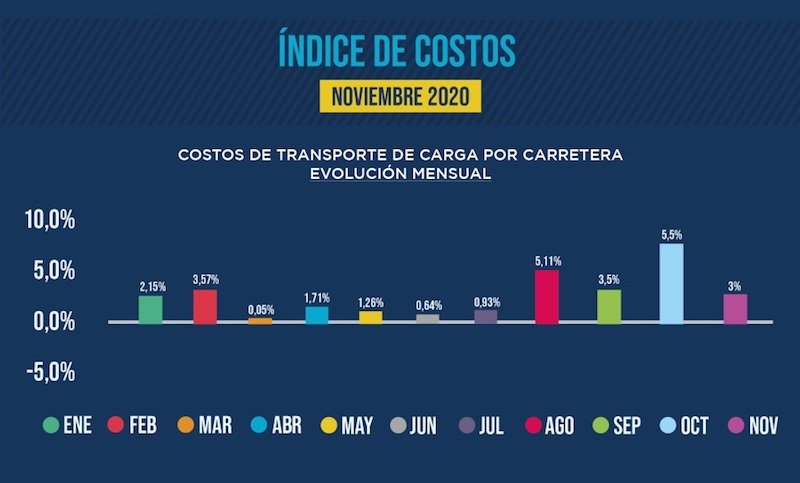 Según el Departamento de Estudios Económicos y Costos de la Federación Argentina de Entidades Empresarias del Autotransporte de Cargas (FADEEAC) el mes de noviembre registró un incremento de 3,04 %, en línea con la tendencia a la aceleración que se registró durante los últimos cuatro meses, con aumentos de 5,11%, 3,5%, y 5,52 % para agosto, septiembre y octubre, respectivamente. La variación acumulada se mantiene en torno al 34% en los últimos doce meses, lo cual confirma una tendencia a la desaceleración de los costos en comparación a los muy elevados de los dos años previos: el 2019 cerró con un 47% y el 2018 con un valor récord de 61,5 %, el registro más alto desde 2002. Estos datos surgen del Índice de Costos del Transporte FADEEAC (ICTF) elaborado mes a mes por la Federación y que mide 11 rubros que impactan directamente en los costos de las empresas del transporte de cargas de todo el país. La metodología del índice es verificada por el Centro de Investigación en Finanzas de la Universidad Torcuato Di Tella (UTDT) a partir de datos primarios y una estructura de costos obtenidos de manera independiente por la Federación.