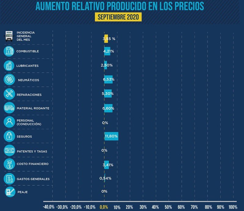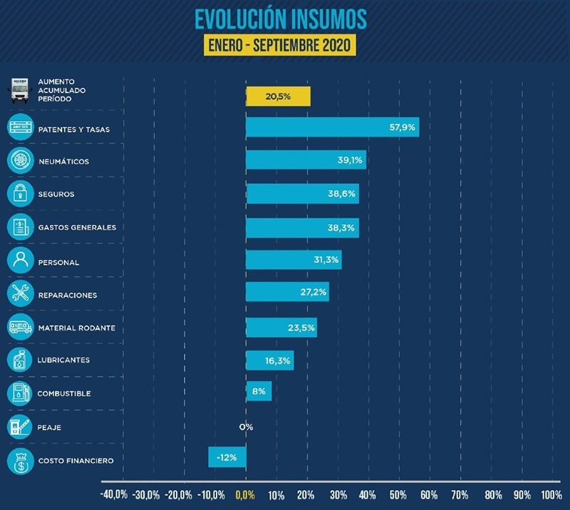 Por último, los lubricantes (2,5 %) y gastos generales (0,54 %) muestran subas menores, mientras que el resto de los rubros (personal, patentes y tasas, peajes), con excepción del costo financiero (3.41 %), no han sufrido modificaciones en relación con agosto de 2020.