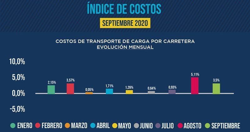 Según el Departamento de Estudios Económicos y Costos de la Federación Argentina de Entidades Empresarias del Autotransporte de Cargas (FADEEAC) el mes de septiembre registró un 3,5 % de incremento, luego de la suba del 5,1 % del mes de agosto, la más alta en lo que va del año. Los datos surgen del Índice de Costos del Transporte FADEEAC (ICTF) elaborado mes a mes por la federación y que mide 11 rubros que impactan directamente en los costos de las empresas del transporte de cargas de todo el país. La metodología del índice fue verificada por el Centro de Investigación en Finanzas de la Universidad Torcuato Di Tella (UTDT) a partir de datos primarios y una estructura de costos obtenidos de manera independiente por la federación.