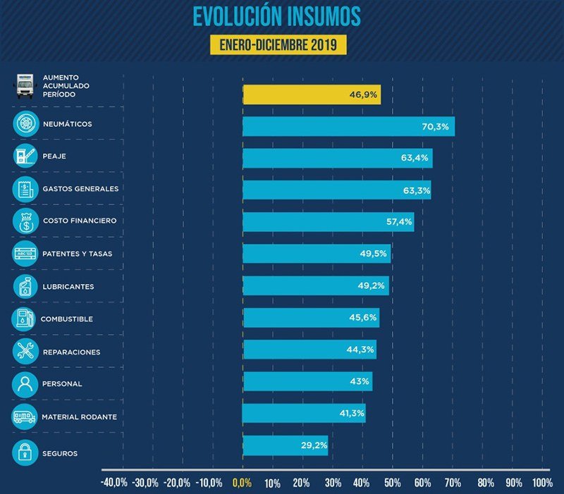 Por el lado del resto de los rubros lideran nuevos aumentos seguros (11,80 %) y neumáticos (6,5 %), de sostenidas subas en los últimos meses, y de material rodante (6,6 %) y reparaciones (5,3 %). Los aumentos se dan en el marco de la aceleración de la política de minidevaluaciones del tipo de cambio oficial y las nuevas restricciones cambiarias.