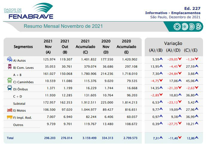 “Luego de cinco meses de caídas consecutivas, el Sector reaccionó en noviembre y creo que podemos cerrar el año dentro de nuestras proyecciones de crecimiento (11,1% para el año 2021). Dados los desafíos enfrentados en los últimos meses, como la crisis de suministro global y las altas tasas de interés en el país, creo que es un gran desempeño, incluso en una base comparativa menor, a partir de 2020. Los buenos resultados de Autobuses, Motocicletas y Comerciales Ligeros son dignos de mención. Todo creció consistentemente en noviembre”, analizó Alarico Assumpção Júnior, presidente de FENABRAVE.