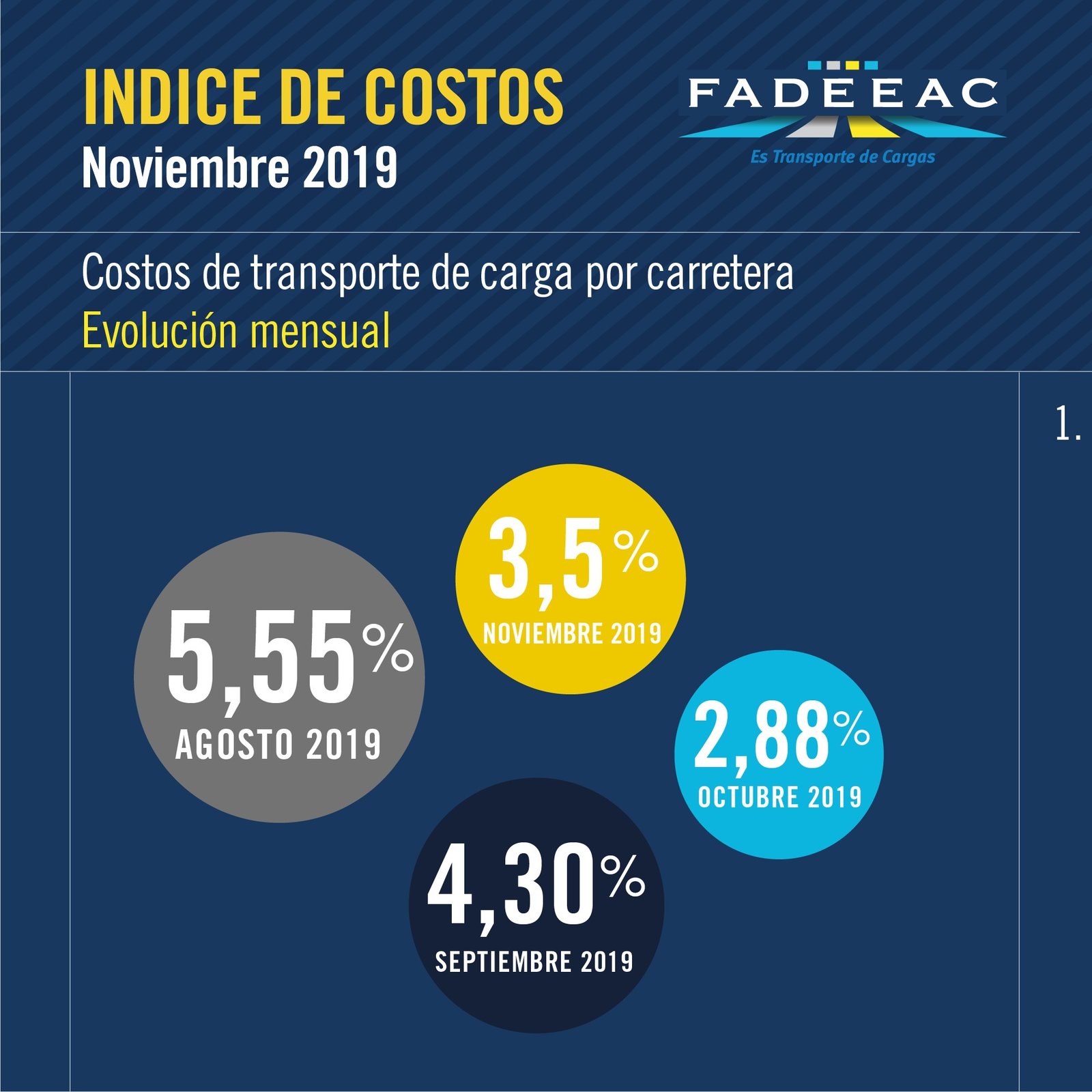 El estudio, realizado por el Departamento de Estudios Económicos y Costos de FADEEAC, mide 11 rubros que impactan directamente en los costos de las empresas de transporte de cargas por carretera de todo el país, y es referencia en buena medida para la fijación o ajuste de las tarifas del sector.