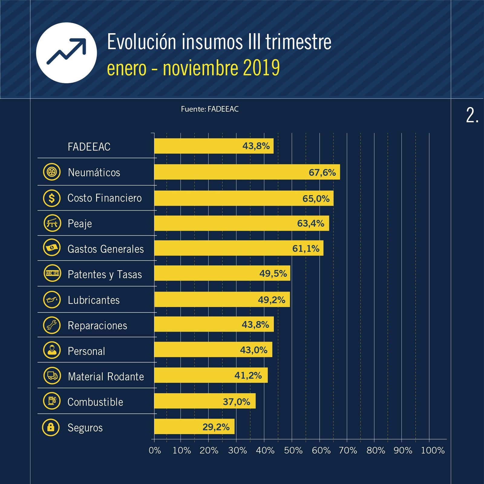 Entre los rubros con mayor aumento, se destacaron Lubricantes, que treparon un 8.5% en el último mes, y en Neumáticos, que, con un 3.16 %, es el rubro que lidera los aumentos de costos en 2019 (67.6 %). También en noviembre se incrementaron los Seguros (2.92 %) y los Gastos Generales (1.9 %).