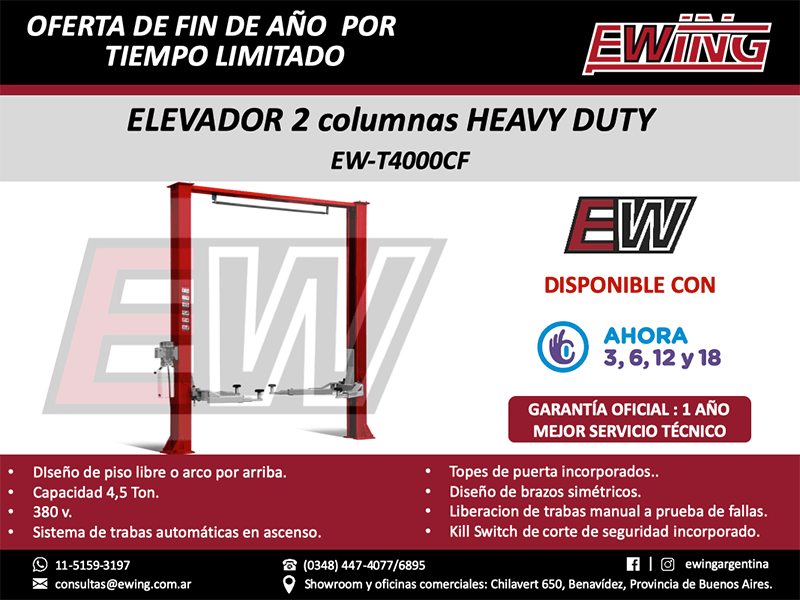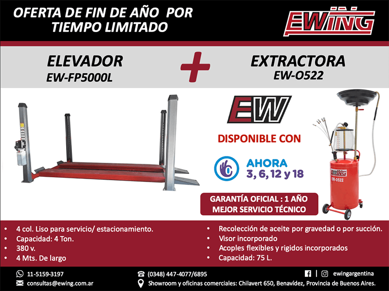 En EWING®, que trabaja e invierte fuerte, encontrarás lo más completo en equipamiento para armar un Taller Mecánico, Lubricentro o Gomería, porque tenemos la línea más amplia de elevadores, desarmadoras, balanceadoras, alineadoras, compresores, extractoras, hidráulicos, y mucho más disponible para que puedas seguir creciendo y adicionando servicios a tu negocio.