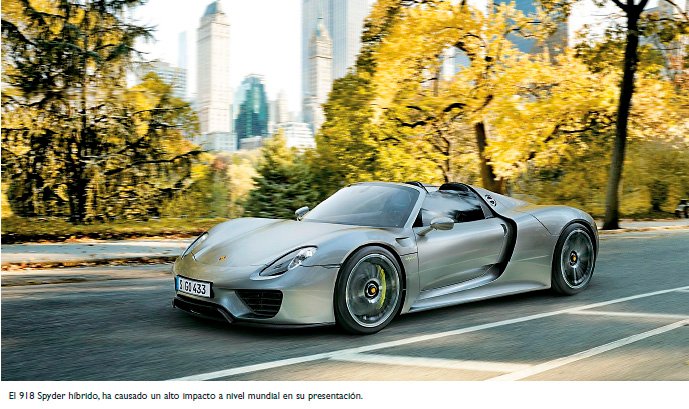 El Porsche 918 Spyder Híbrido, es sin duda un superdeportivo que no emite practicamente CO2, es decir no contamina, parecido a un prototipo de Le Mans. Un spyder híbrido con 3 motores, uno térmico y dos eléctricos.