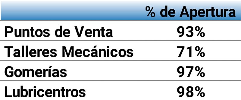 De acuerdo a dicha investigación, efectuada sobre más de 400 comercios (Casas de Repuestos, Talleres, Gomerías y Lubricentros), más del 80% de los locales abrieron sus puertas: