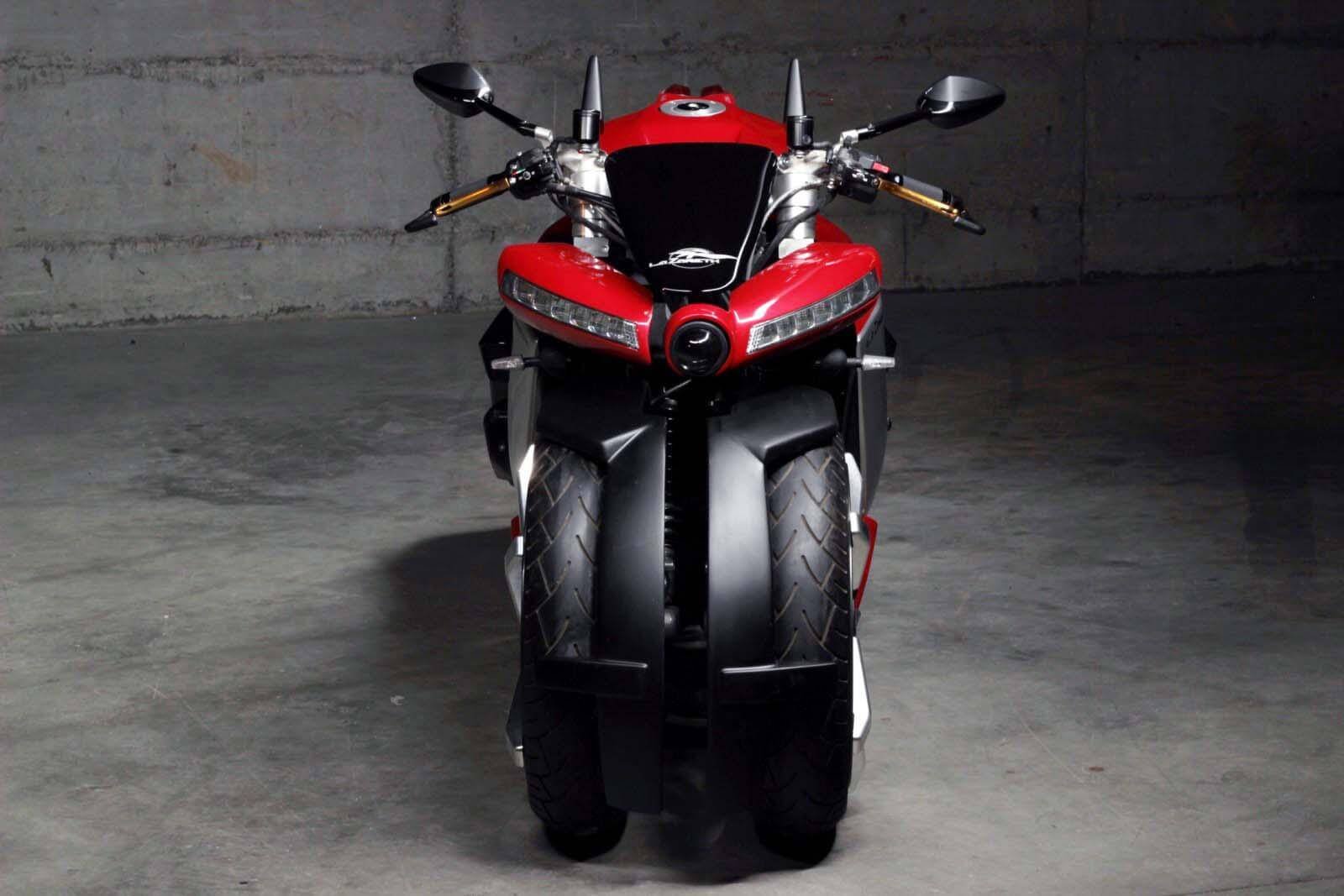 Obviamente que las cuatro ruedas facilitan que la moto se mantenga de pie mientras está frenada, y en las curvas, un conjunto de ejes y bisagras posibilitan que se incline sin problema alguno.