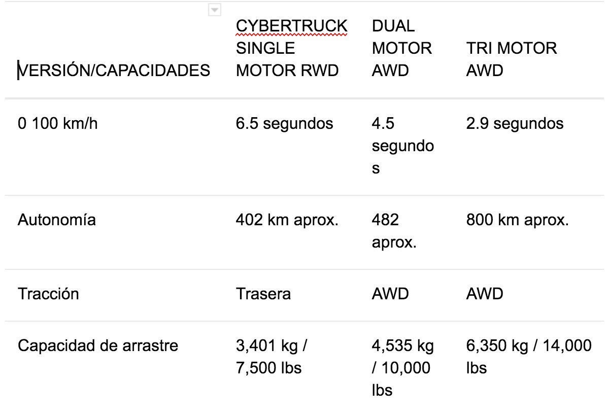 La Tesla Cybertruck contará con varias versiones de distintas autonomías, capacidad de arrastre y equipamiento. De momento se revelan tres versiones una con un sólo motor de tracción trasera, otra de dos motores con tracción AWD y una tercera de tres motores y tracción AWD con mucha mayor capacidad de manejo off-road.