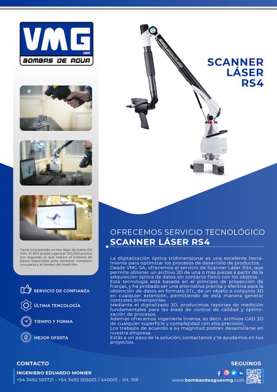 Desde VMG SA, ofrecemos el servicio de Scanner laser RS4, que permite tener un archivo de 3D de una o más piezas a partir de la adquisición óptica de datos sin contacto físico con los objetos.