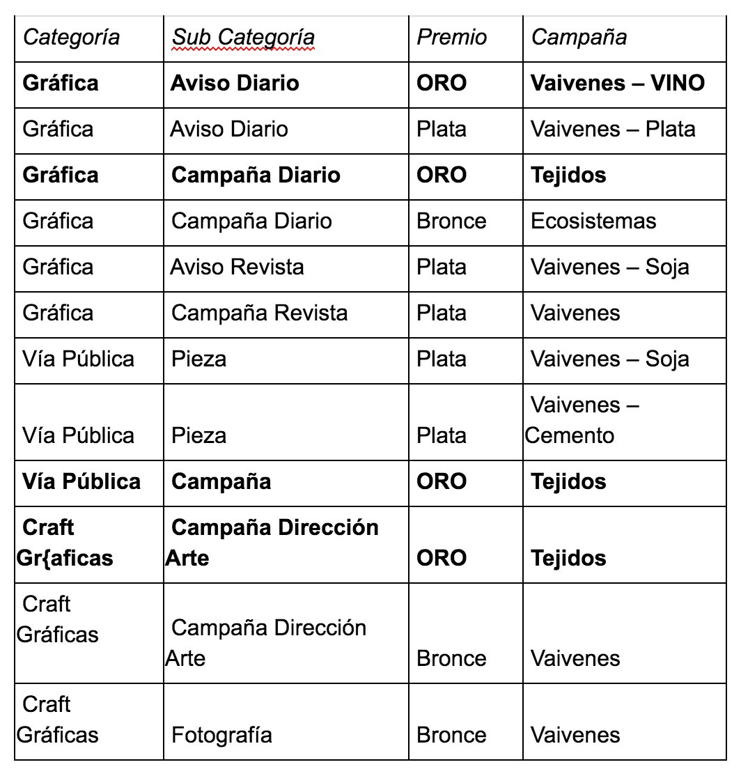 Las campañas “Vaivenes” y “Tejidos” y “Ecosistema”, han obtenido 12 premios en diferentes categorías por Círculo de Creativos argentinos.