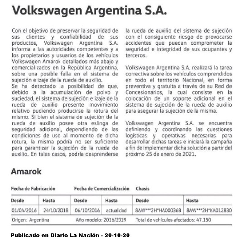 Ante la posibilidad de un desperfecto en el sistema de sujeción de la rueda de auxilio, que podría causar que la misma se suelte durante la marcha y caiga al camino, Volkswagen Argentina realizará un recall de su pick up mediana Amarok.