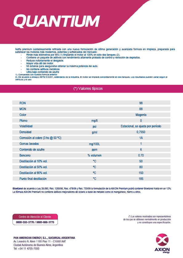 Un comunicado de Axion aclara que el nuevo producto tiene octanaje mayor a 98, limpia el 100% del motor en solo dos tanques y rinde más kilómetros por litro, lo que garantiza un gran desempeño del motor y optimización de consumo. Es producido en la refinería de Campana, donde el grupo está llevando adelante un plan de inversión de USD 1.500 millones que le permitirá aumentar en 60% su producción de combustibles. "Quantium Tiene ultra bajo contenido de azufre y contiene un paquete de químicos no metálicos con rendimiento probado en control y remoción de depósitos, como así también consigue una reducción de la fricción con menor desgaste del motor", explicaron.
